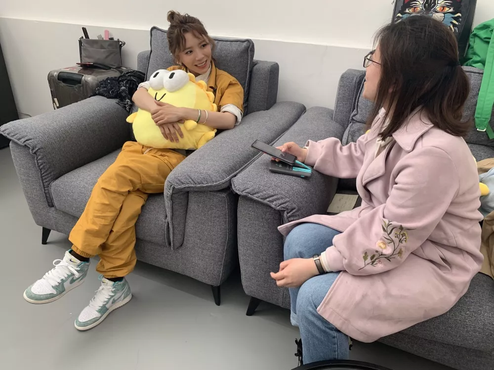 這次活動似乎真的有太多明星關注,這套灰色沙發的身影也出現在了不同大咖的微博里(上圖為演員徐樂同(展覽客串主持)微博截圖,下圖來自黑人建州微博視頻截圖,圖為李子璇小豆子在即興舞蹈)。